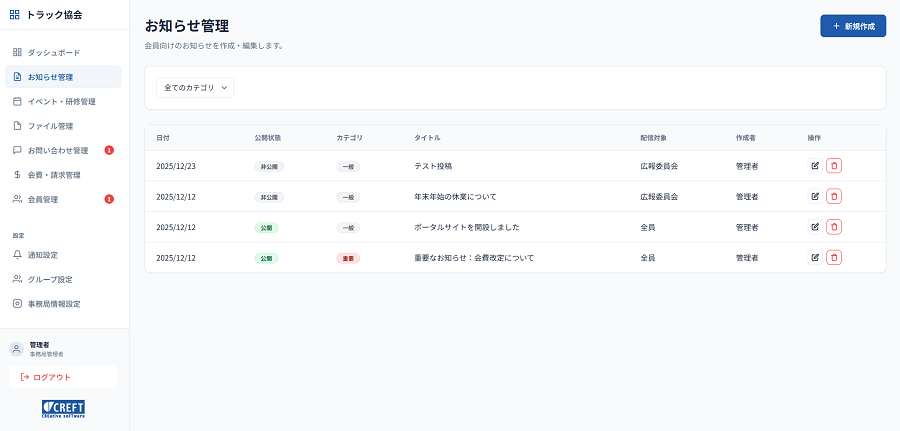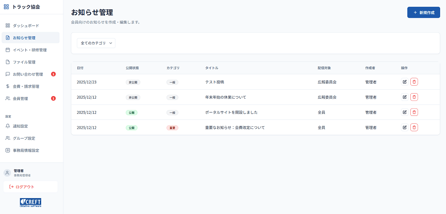 | お知らせ管理 | 記事作成(画像・装飾可)、配信対象設定(全体・グループ別)、即時公開/非公開、会員へのメール自動通知 | 会員全体や特定の部会員に対して、重要事項を迅速に一斉配信できます。 |