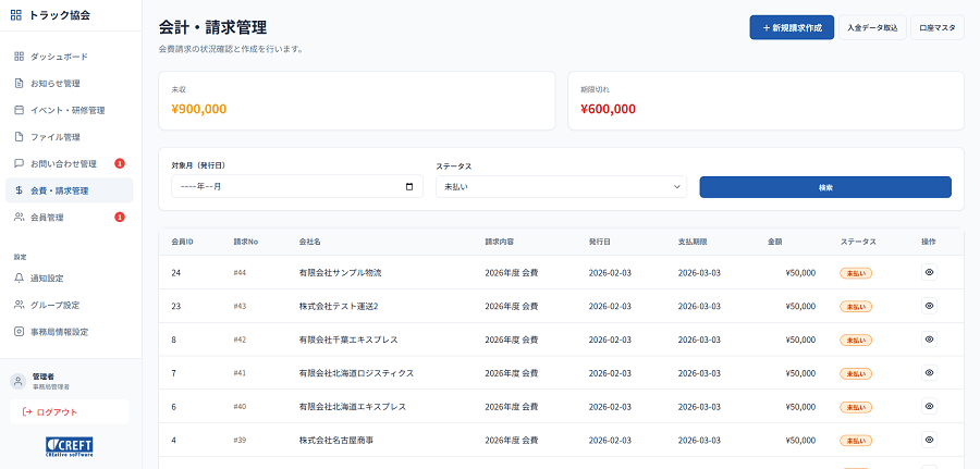 | 請求・入金管理 | 請求一覧の確認、振込入金の手動消込登録、入金完了時の会員への自動確認通知メール | 銀行振込の入金確認を会員画面に即時反映し、確認の手間を削減できます。 |