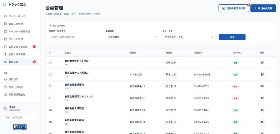 | 会員管理 | 会員名簿の検索・編集、在籍/退会ステータス管理、会員からの変更申請の承認・履歴管理 | 正確な会員データベースを維持し、会員ごとの対応履歴も一元管理できます。 |