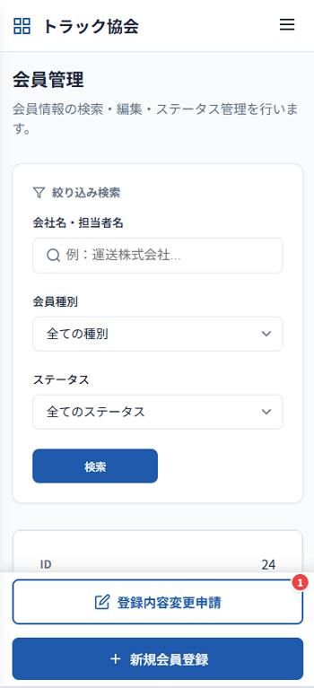 | 登録情報確認・変更 | 自社の登録データの閲覧、事務局への変更申請(住所変更・代表者等) | 登録情報の変更を24時間いつでもWebから申請でき、正確な情報を維持できます。 |