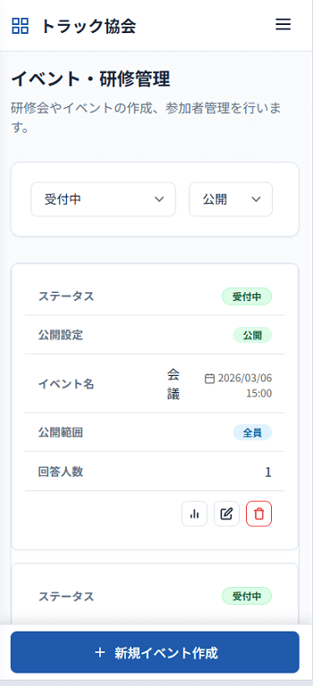 | イベント・研修管理 | 行事の告知、参加申込の受付管理、参加者アンケート項目設定、回答データのCSV一括ダウンロード | 研修会等の案内から申込受付、当日の名簿作成までをデジタルで完結できます。 |