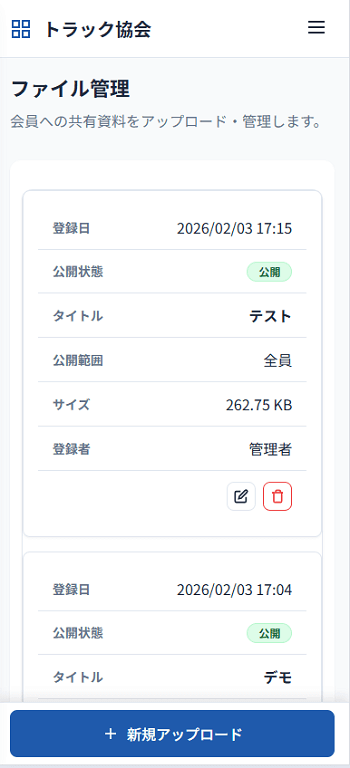 | ファイル管理 | 会員向け配布資料(PDF等)のアップロード・公開・削除管理 | 定款や申請書、役員名簿などの共通資料を常に最新の状態で共有できます。 |